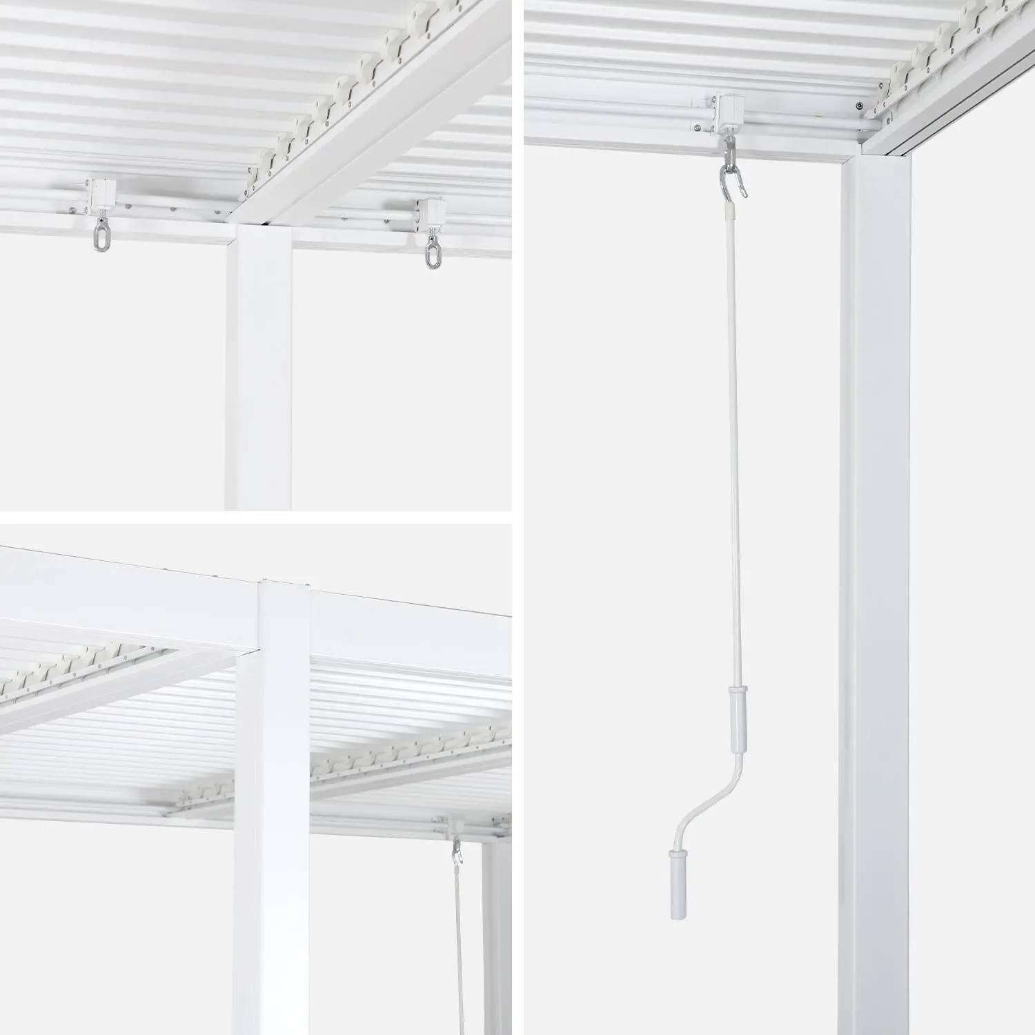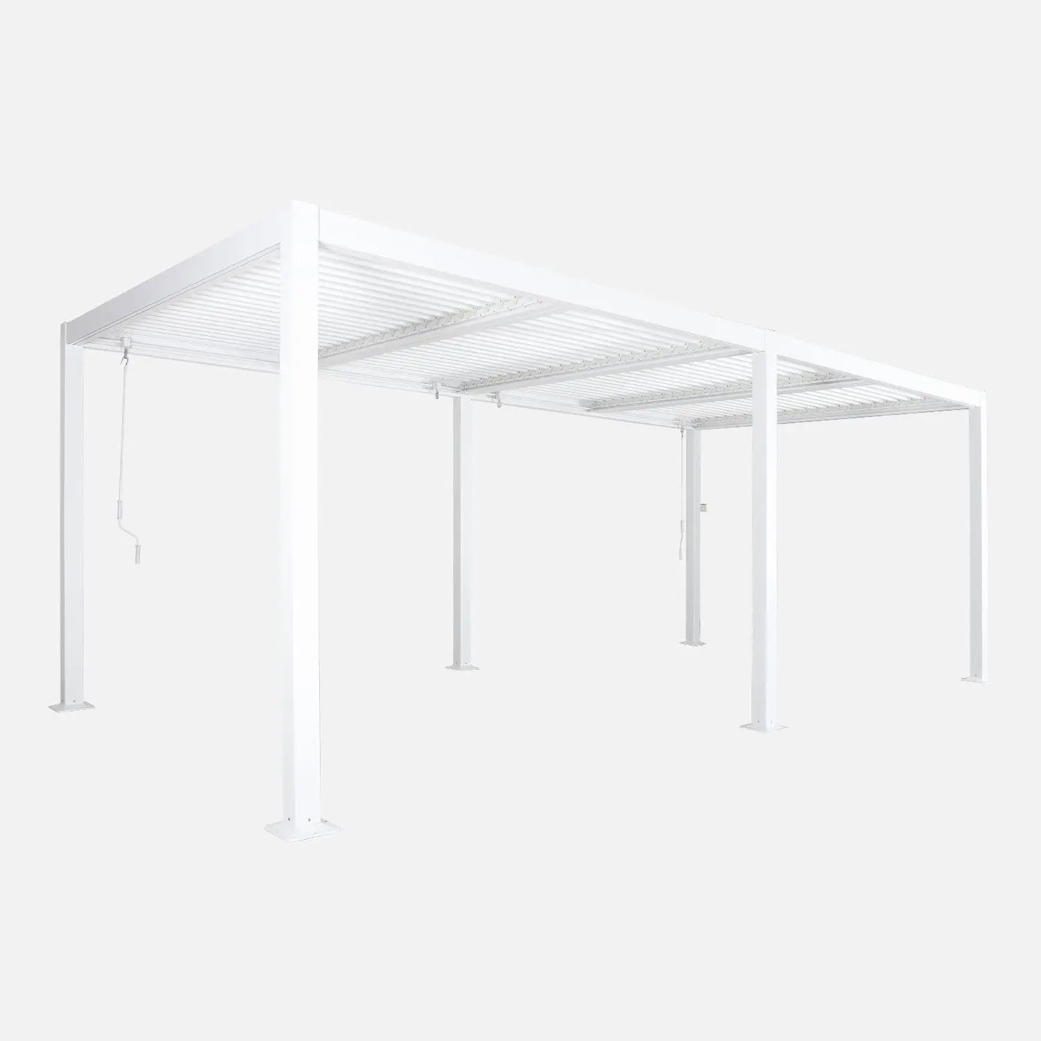 Die Dachfläche lässt sich dank neigbarer Lamellen, die per Handkurbel bewegt werden, flexibel öffnen und schließen. Das Lamellensystem besteht aus zwei Reihen, die unabhängig voneinander verstellt werden können – so lässt sich bei Bedarf auch nur eine Hälfte der Pergola beschatten.