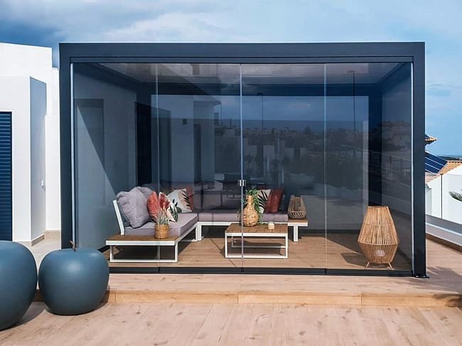 Die hochwertige retractable Pergola SIROCO von Intersun mit Aluminiumlamellen im Akkordeonstil ermöglicht es Ihnen, die Sonneneinstrahlung auf Ihrer Terrasse jederzeit nach Bedarf zu regulieren. Im Gegensatz zu festen Systemen bietet sie die Flexibilität, den Außenbereich nach Wunsch freizulegen und gleichzeitig optimalen Sonnenschutz zu gewährleisten. Die Struktur aus extrudiertem Aluminium ist witterungs- und UV-beständig und garantiert Komfort sowie Langlebigkeit. Mit ihrem eleganten, minimalistischen Design fügt sie sich harmonisch in jede Architektur ein.