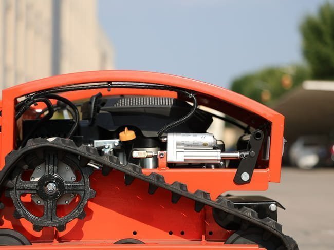 Der elektrische Raupenantrieb und der Benzinmotor für das Mähwerk ermöglichen eine hohe Effizienz und kontrollierte Kraftübertragung.