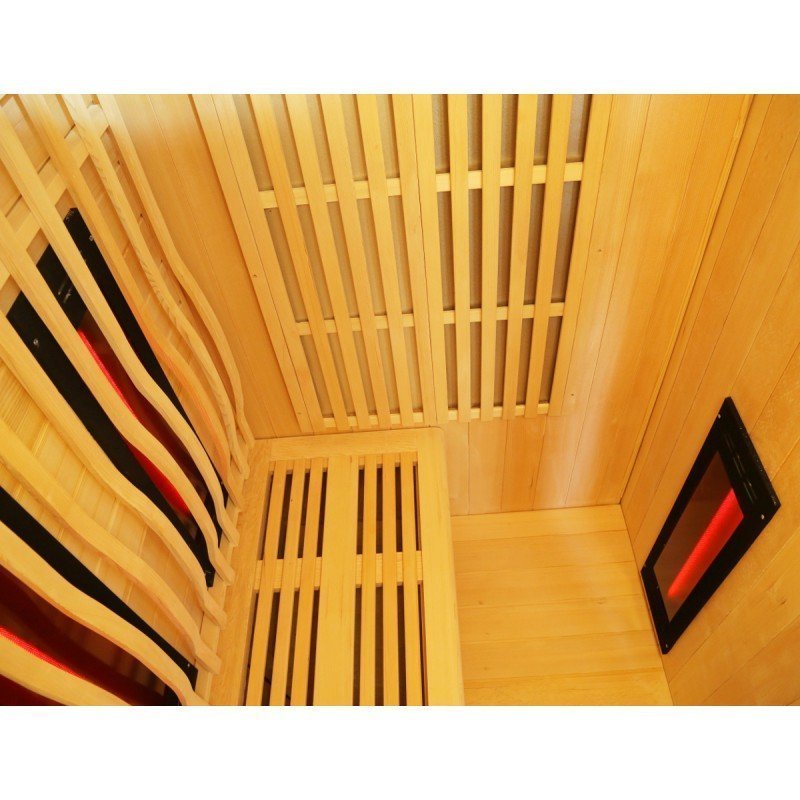 Das Design dieser Kollektion setzt auf elegante Schlichtheit und einen hochwertigen Look. Die Kabine besteht aus kanadischem Holz mit vertikalen Leisten, betont durch eine schwarze Bodenlinie und einen schwarzen Dachrahmen. Innen überzeugt die Ausstattung durch die Kombination aus Carbonstrahlern und Rotlicht-Vollspektralstrahlern, die eine beeindruckende Leistung bieten. Die Kabine erwärmt sich schnell und gleichmäßig, sodass jederzeit entspannte Saunasitzungen möglich sind – im Gegensatz zu klassischen Saunakabinen, die deutlich mehr Zeit zum Aufheizen benötigen. Beide Heizsysteme können unabhängig voneinander gesteuert werden.