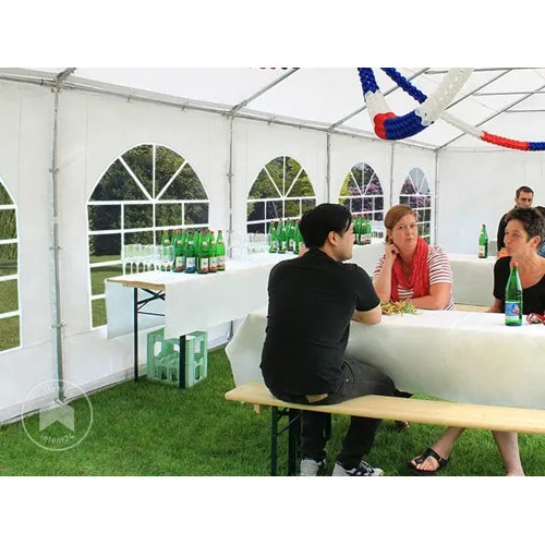 Wir bieten ein breites Sortiment an Partyzelten an – von preisgünstigen und robusten PE-Zelten bis hin zu PVC-Zelten mit Brandschutzzertifizierung und statischer Berechnung. Die Partyzelte von Carpasol sind 100 % wasserdicht, UV-beständig und verfügen über abnehmbare Seitenwände. Diese gewährleisten eine kontinuierliche Frischluftzufuhr im Zelt, ohne Luftzug zu erzeugen. Sowohl die Front- als auch die Seitenwände können abgenommen werden und ermöglichen so zahlreiche Zugangsmöglichkeiten. Die Gestänge dieser Produkte bestehen aus vollständig verzinktem Stahl. Für einen langfristigen Einsatz im Außenbereich empfehlen wir unsere besonders robusten Partyzelte. Je nach Modell sind die Zelte zusätzlich mit verstärktem Bodenrahmen und mehreren Dachverstärkungen ausgestattet.