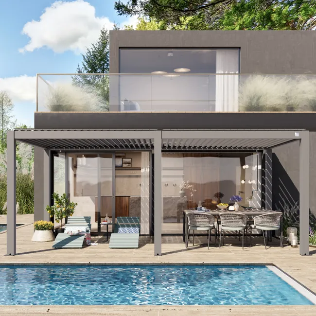 Die hochwertige retractable Pergola SIROCO von Intersun mit Aluminiumlamellen im Akkordeonstil ermöglicht es Ihnen, die Sonneneinstrahlung auf Ihrer Terrasse jederzeit nach Bedarf zu regulieren. Im Gegensatz zu festen Systemen bietet sie die Flexibilität, den Außenbereich nach Wunsch freizulegen und gleichzeitig optimalen Sonnenschutz zu gewährleisten. Die Struktur aus extrudiertem Aluminium ist witterungs- und UV-beständig und garantiert Komfort sowie Langlebigkeit. Mit ihrem eleganten, minimalistischen Design fügt sie sich harmonisch in jede Architektur ein.