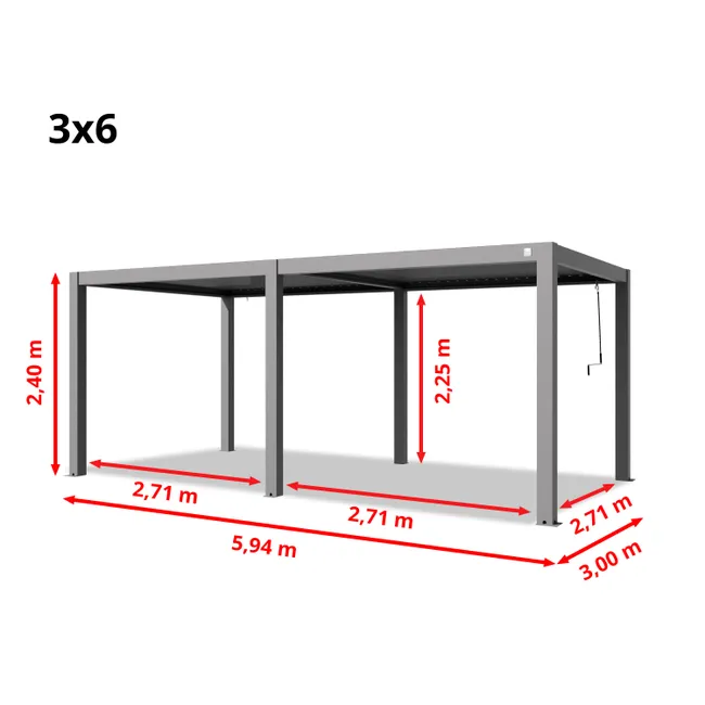 Pase momentos agradables y conviviales en su jardín gracias a la pérgola bioclimática Palace 3 x 6 m. Esta pérgola tiene la particularidad de adaptarse al clima. Le protege de la lluvia en invierno y le permite disfrutar del sol en verano y apreciar su sombra y frescura. La pérgola es una instalación permanente ya que se debe fijar al suelo. No necesita guardarla en invierno, podrá disfrutarla todo el año. Gracias a su diseño ligero y elegante, aportará un toque de modernidad a su jardín. Con sus dimensiones, encontrará