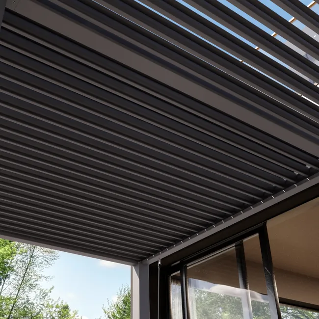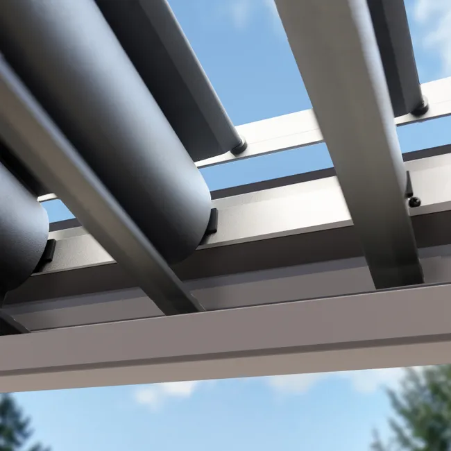 Das Dach besteht aus robusten Aluminiumlamellen mit Hohlkammerprofil und Pulverbeschichtung.