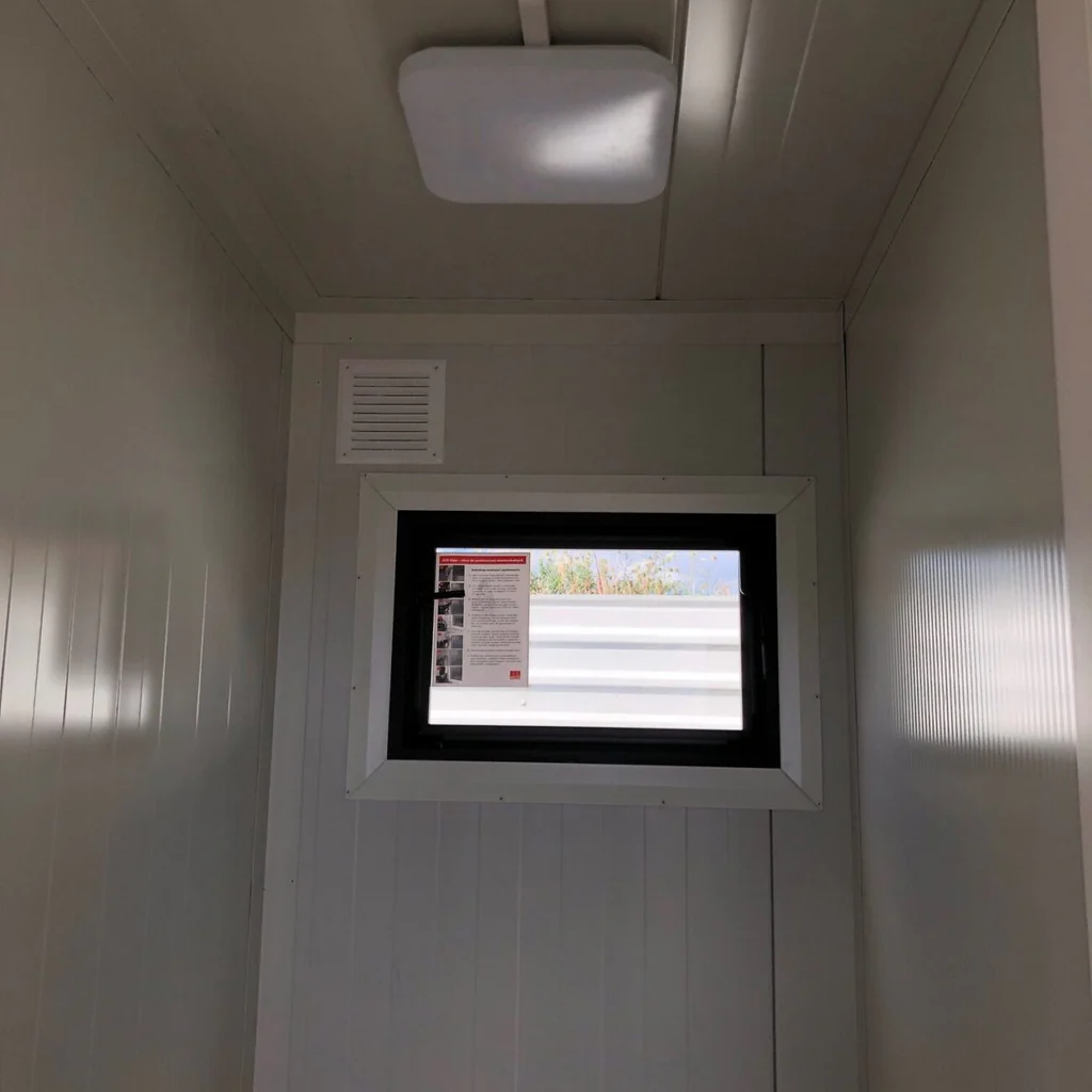 Der aus Sandwichpaneelen gefertigte Container bietet eine funktionale und komfortable Raumaufteilung mit mehreren separaten Bereichen. Dazu gehören ein vollständig ausgestattetes Herren-WC, ein Doppel-WC für Damen, ein Abstellraum sowie ein barrierefreies WC, das über eine speziell konzipierte Rampe zugänglich ist.