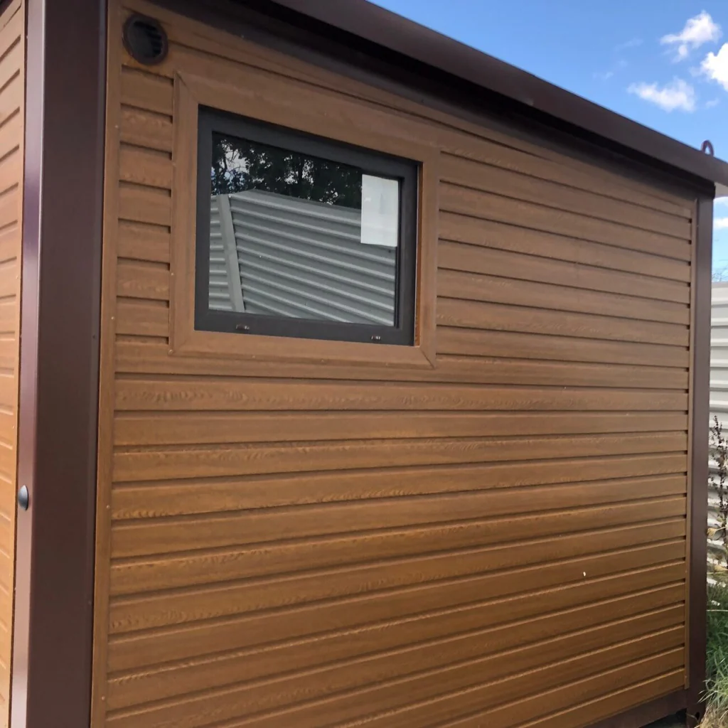 Version: Modulares Sanitärgebäude (WC – URINAL – DUSCHE – WASCHBECKEN) + Außenverkleidung aus Stahl im hellen Holzstil, 30 Jahre Garantie